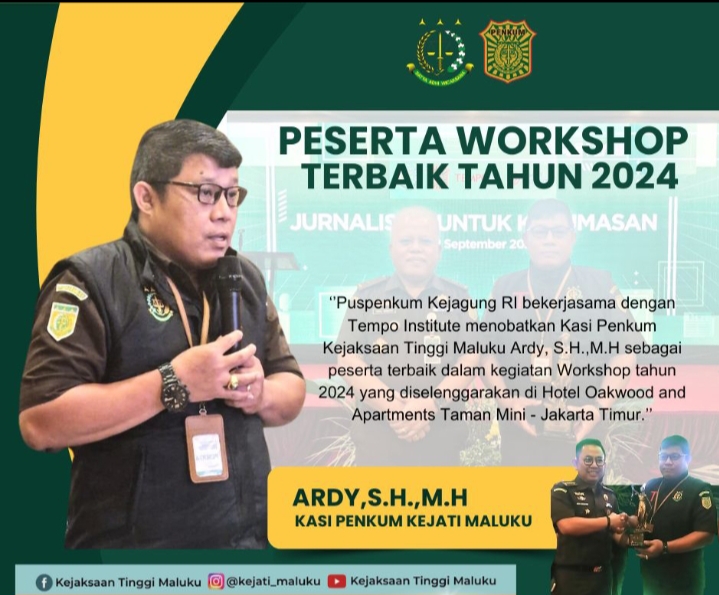 Warta-kota.com Maluku- Puspenkum Kejagung RI bekerjasama dengan Tempo Institute, menobatkan Kasi Penkum Kejaksaan Tinggi Maluku Ardy, S.H.,M.H sebagai peserta terbaik dalam kegiatan Workshop tahun 2024 yang diselenggarakan di Hotel Oakwood and Apartments Taman Mini – Jakarta Timur.