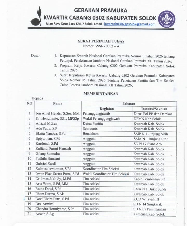 Ketua Kwarcab 0302 Kabupaten Solok, H. Candra yang juga menjabat sebagai Wakil Bupati Solok, menyampaikan bahwa keikutsertaan Kabupaten Solok dalam Jambore Nasional XII 2026 harus dipersiapkan secara matang.